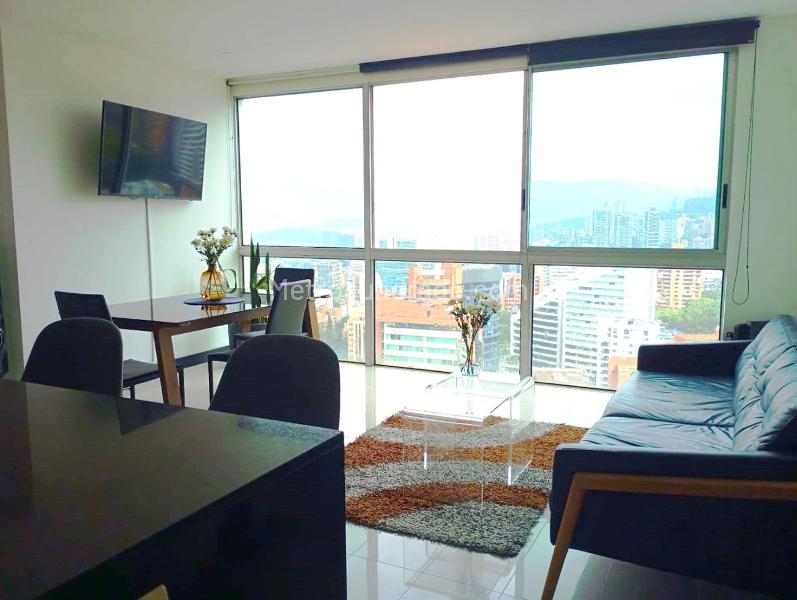 Furnished apartment for rent in a gated community located two blocks from shopping centers, public transport routes, and easy access from the main avenue. It features marble flooring, a living-dining room, 1 bedroom with a private bathroom, a social bathroom, an open American-style kitchen, and covered parking. The unit offers a pool, gym, sauna, green areas, 24-hour security, intercom, and CCTV.