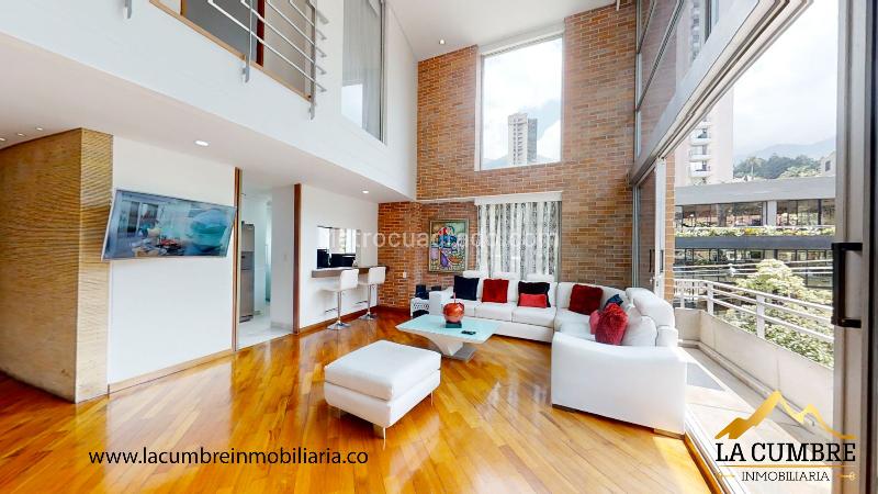Duplex, furnished apartment for rent located in the El Poblado, El Tesoro area. It has 2 bedrooms, 3 bathrooms, and a service bedroom with its bathroom, plus a double covered parking space. The unit includes an elevator, swimming pool, gym, sauna-turkish bath, sports court, green areas, children's play areas, a social room, visitor parking, and 24-hour security. The location is ideal, with easy access to main roads, shopping centers, and public transportation.