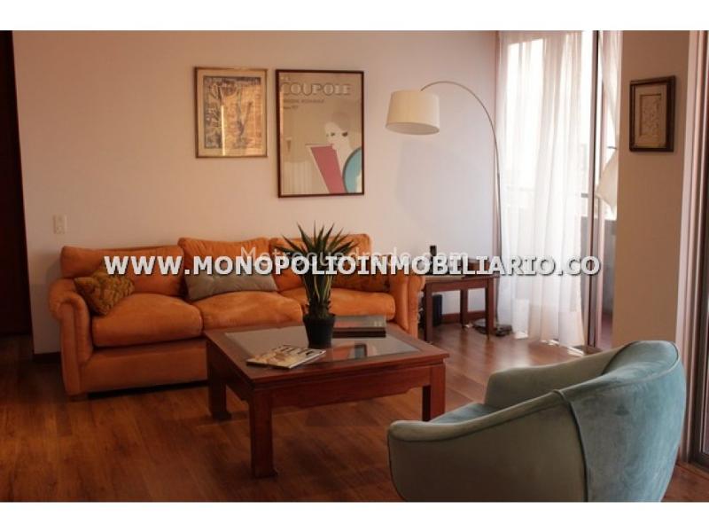 Beautiful furnished apartment for rent, approximately 120 square meters, in El Poblado, 9th floor, stratum 6 in a gated community. Inside, it features comfortable living and dining room furniture, two bedrooms each with a closet, equipped with a double bed and a single bed, service room, one private bathroom and one social bathroom with tempered glass enclosures; functional integral kitchen with American bar and two stools, lower and upper cabinets, refrigerator, microwave, and necessary utensils, gas network, laundry area with washer and dryer, balcony, and large windows. Linens, a plasma TV, auxiliary furniture, desk, and hammock. Laminated wood flooring, excellent condition paint. Covered parking, garbage chute, and elevator. 24-hour security, pedestrian paths, green areas, adult pool, children's pool, gym, social room, and squash court.