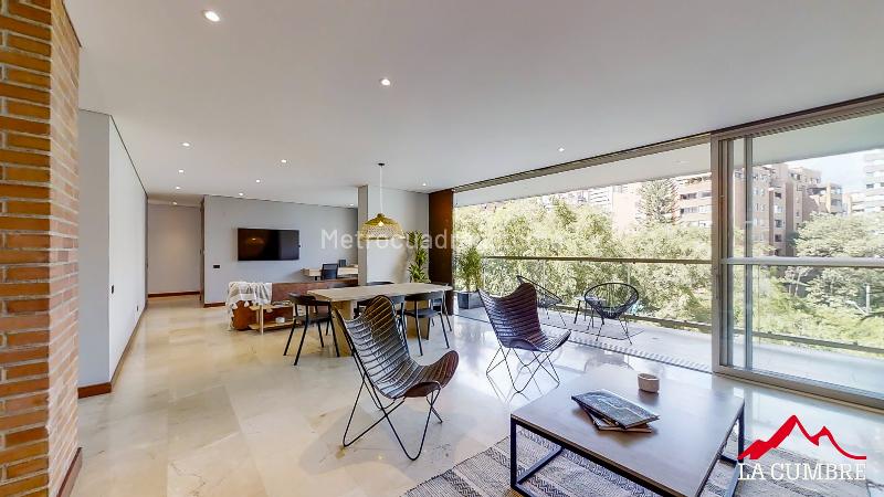 Furnished apartment for rent in a gated community in Alejandría, El Poblado. It features 3 bedrooms, 5 bathrooms, 3 parking spaces, a service room and bathroom, and common areas including a pool, sauna, Turkish bath, gym, social lounge, children's playground, visitor parking. The unit has 24-hour security, ample green areas, and is ideally located with easy access to main roads and public transport.