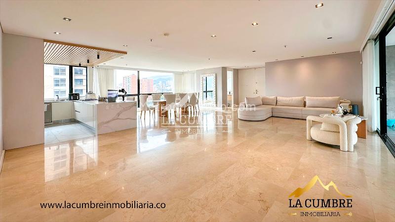 Furnished apartment of 310 square meters for rent located in the Los Balsos sector in El Poblado. It features 3 bedrooms, 4 bathrooms, and triple covered parking. The unit includes a pool, social room, green areas, children's playground, gym, elevator, visitor parking, and 24-hour security. The location is ideal with easy access to main roads, shopping centers, and public transport.