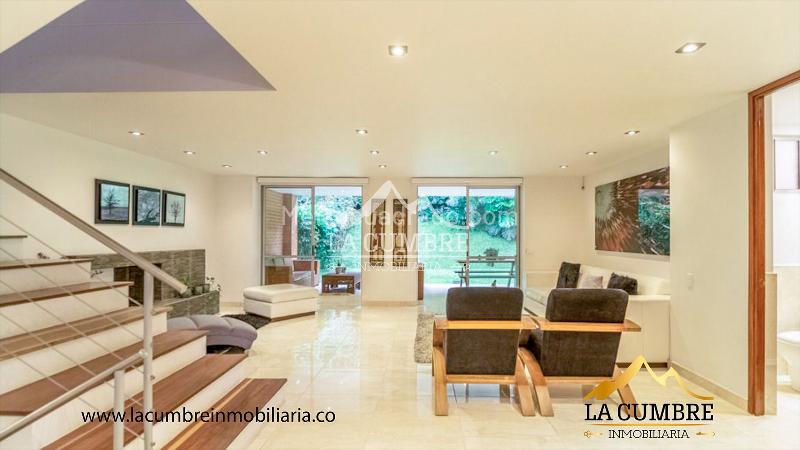 House for rent located in the San Lucas area in Envigado. It features 3 bedrooms, 4 bathrooms, a service room and bathroom, 3 levels, and double covered parking. The unit includes a pool, green areas, children's playground, social room, visitor parking, and 24-hour security. The location is ideal, with easy access to main roads, shopping centers, and public transportation.
