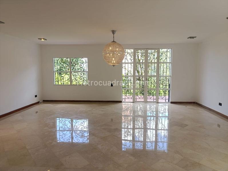 House for rent in a gated community near shopping centers, clinics, chain supermarkets, and access to transport routes and main roads. Features marble and wood flooring, two levels, security door, independent living and dining areas, study, TV room, 4 bedrooms with a bathroom in the master with double dressing room, jacuzzi, garden, semi-open integral kitchen, service room and bathroom, balcony, and covered parallel parking.