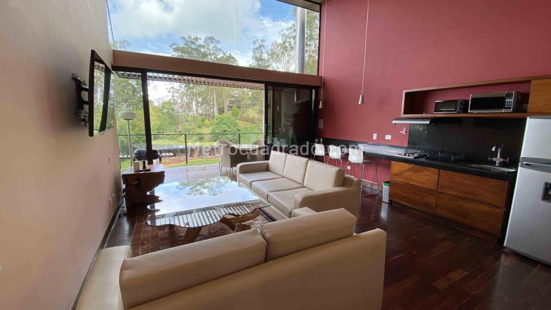 Cabaña en arriendo ubicada en Guatapé, distribuida en dos alcobas, dos baños, cocina integral, balcón y zonas verdes.