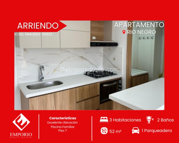 El apartamento, ubicado en el barrio Cimarronas de Rionegro, frente al Club La Macarena, es una excelente opción para arrendar gracias a sus modernos 52 m² y 0 años de antigüedad. Situado en un séptimo piso con vista interna hacia las montañas, la unidad y las zonas sociales, ofrece un ambiente tranquilo y agradable. Cuenta con tres habitaciones, dos baños, sala-comedor, cocina integral, zona de ropas, balcón, closets y calentador ya instalado, además de cortinas. La unidad residencial ofrece completas amenidades, incluyendo gimnasio, piscina, salón social y parqueaderos comunes para residentes y visitantes. Un inmueble moderno, funcional y listo para habitar.