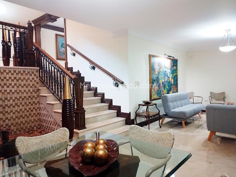 Casa en arriendo en conjunto cerrado cerca de supermercados, clubes, museos y rutas de transporte. Acceso a una amplia variedad de servicios complementarios y ubicada sobre vía principal. Cuenta con pisos en madera y mármol, tres niveles, puerta de seguridad, sala y comedor independientes, estudio, biblioteca, sala de TV, 5 habitaciones con baño en la habitación principal, jacuzzi, cocina integral abierta, cuarto de servicio con baño, terraza, jardín y parqueadero cubierto independiente. La unidad incluye zonas verdes, seguridad 24 horas, citófono y TV en circuito cerrado. *Las propiedades están sujetas a verificación de disponibilidad.*